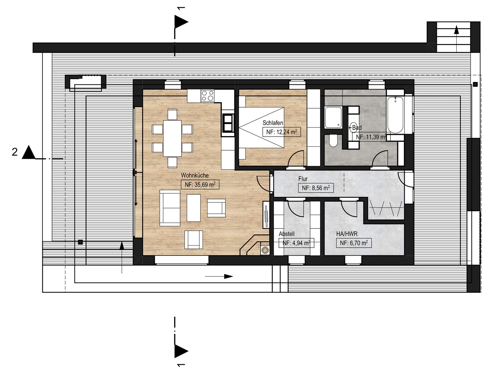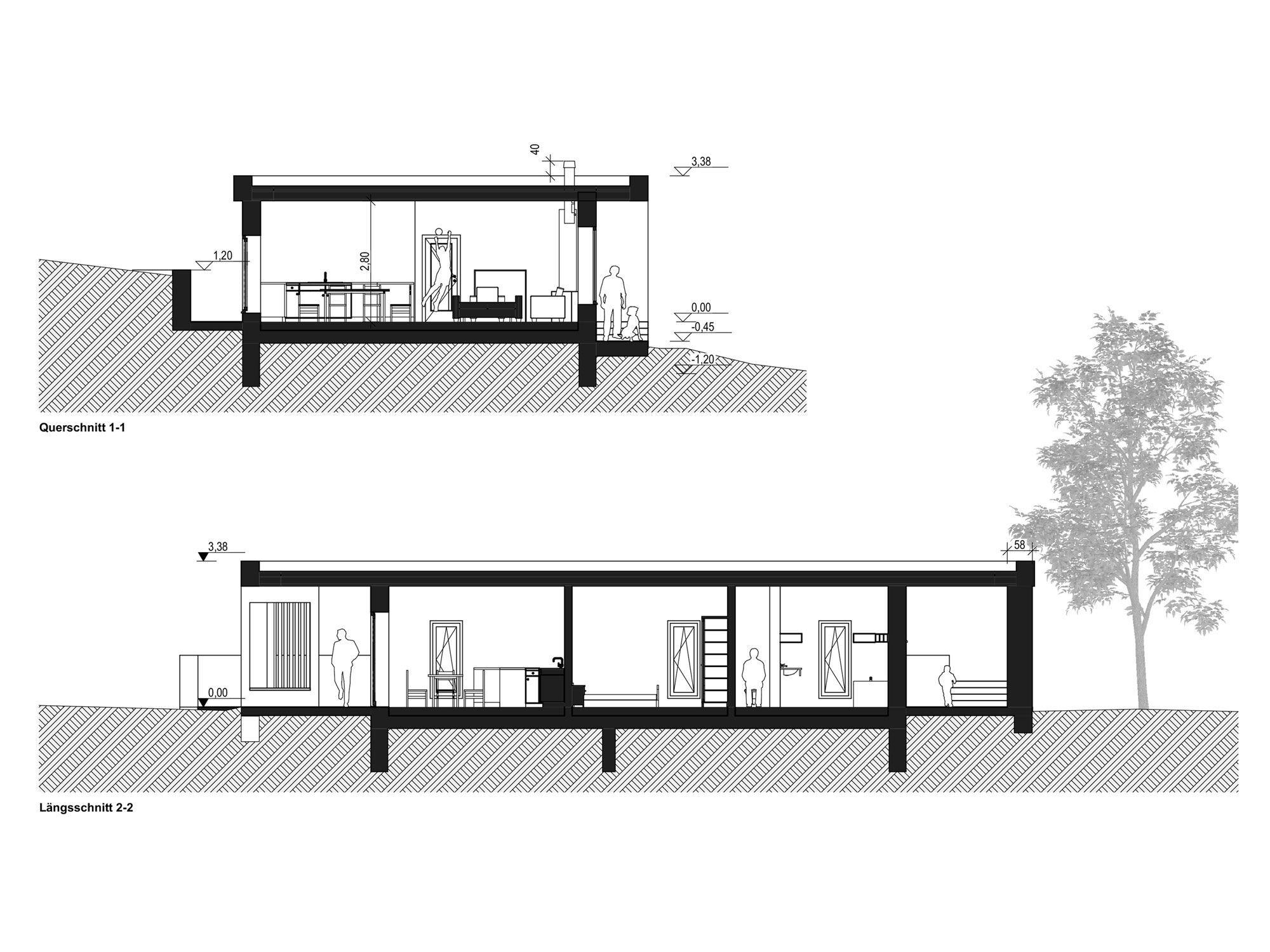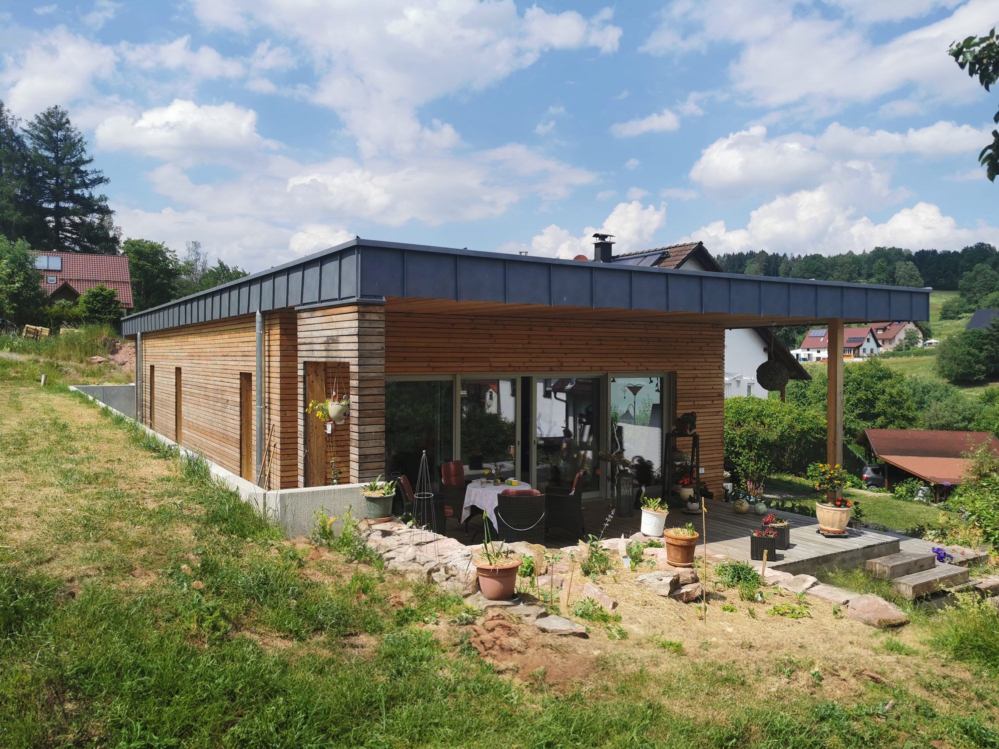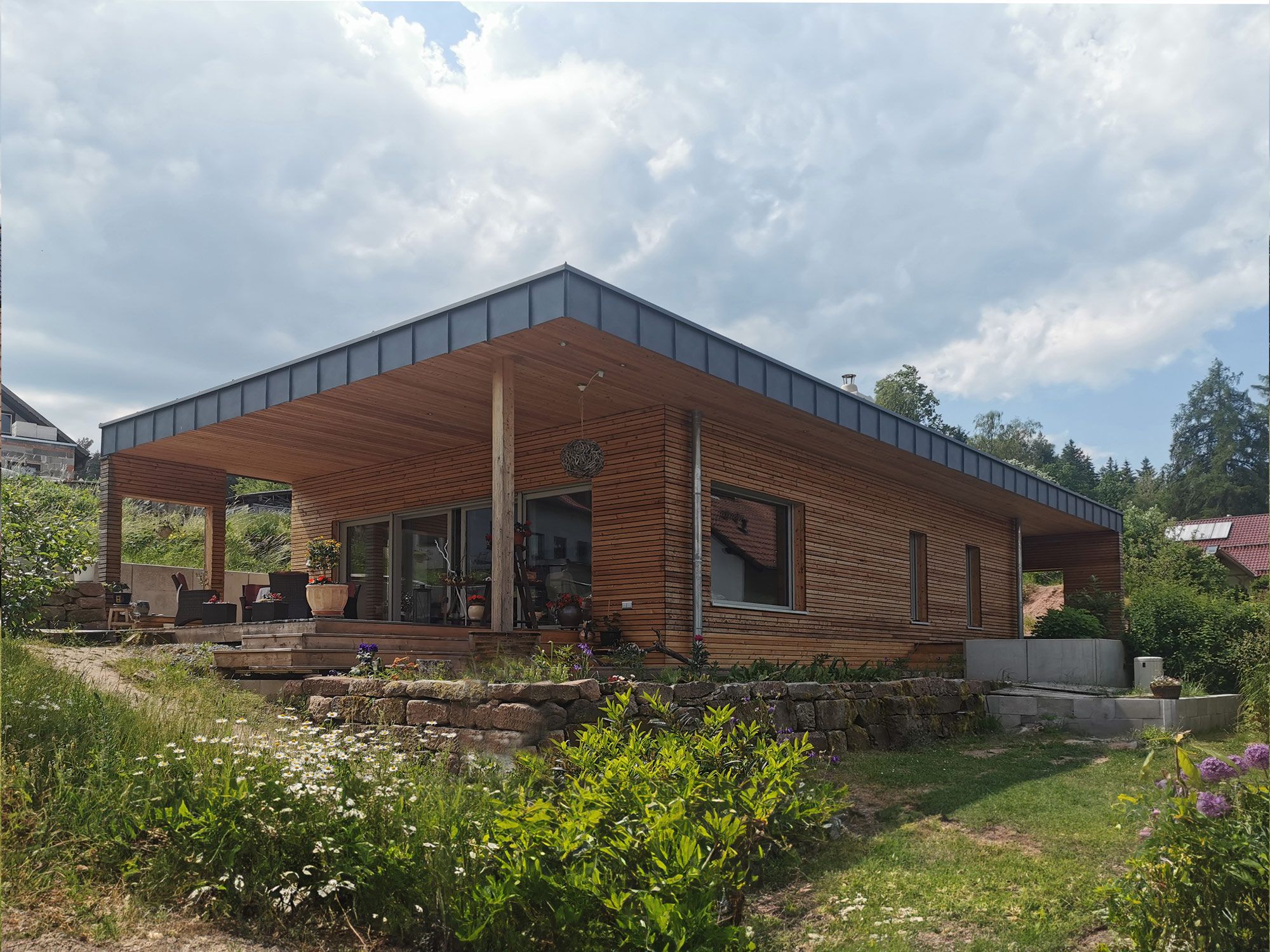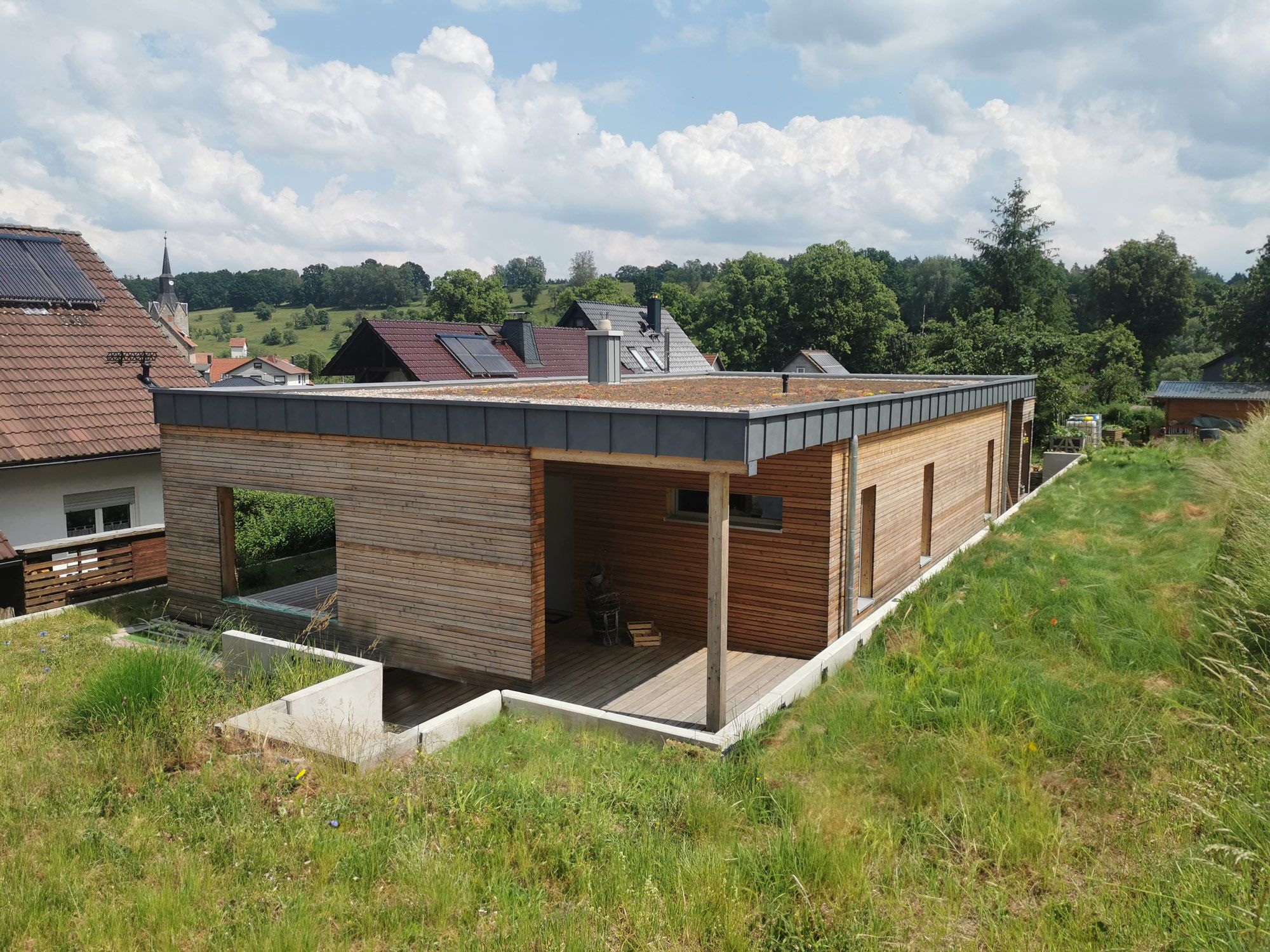 Eine Herausforderung und Chance zugleich stelle für den Bungalow die starke Hanglage dar. Mit dem teils in den Hang eingestelltem Baukörper passt sich der Neubau gut in die Topographie ein. Talseitig gewährt er großartige Ausblicke auf den tieferliegenden Ortskern. Dem ökologischen Anspruch der Bauherren Rechnung tragend wurde der Bau als reiner Holzbau mit Dachbegrünung errichtet. Mit dem Planungspartner Holz100 aus Österreich konnte ein erfahrener Projektpartner für die ökologische Umsetzung gefunden werden. Die bauliche Umsetzung erfolgte ausschließlich mit lokalen Firmen.